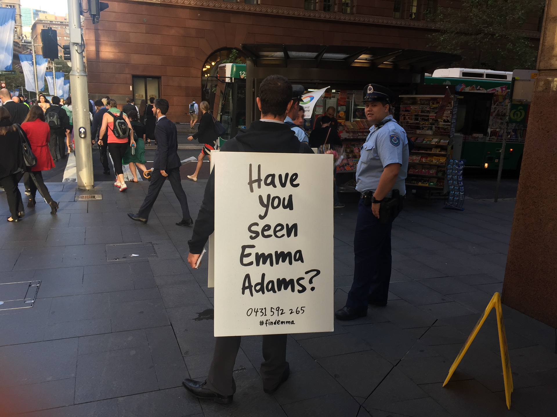 "Have you seen Emma Adams?" was asked 15,000 times on a journey from suburban Newcastle to the steps of the Sydney Opera House.